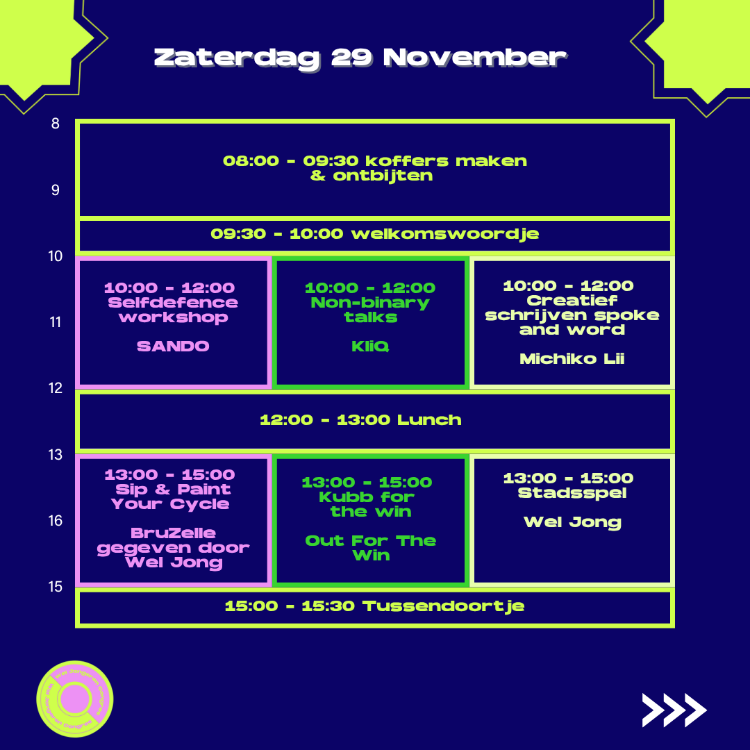 Op zaterdag kan je je creativiteit kwijt in Creatief Schrijven (spoken word) met Michiko Lii, je wandelschoenen aantrekken om de stad Antwerpen te ontdekken, of leren haken bij Crochet & Kiki. En wie even nood heeft om te ontspannen, kan altijd terecht in de chillroom om rustig bij te tanken.