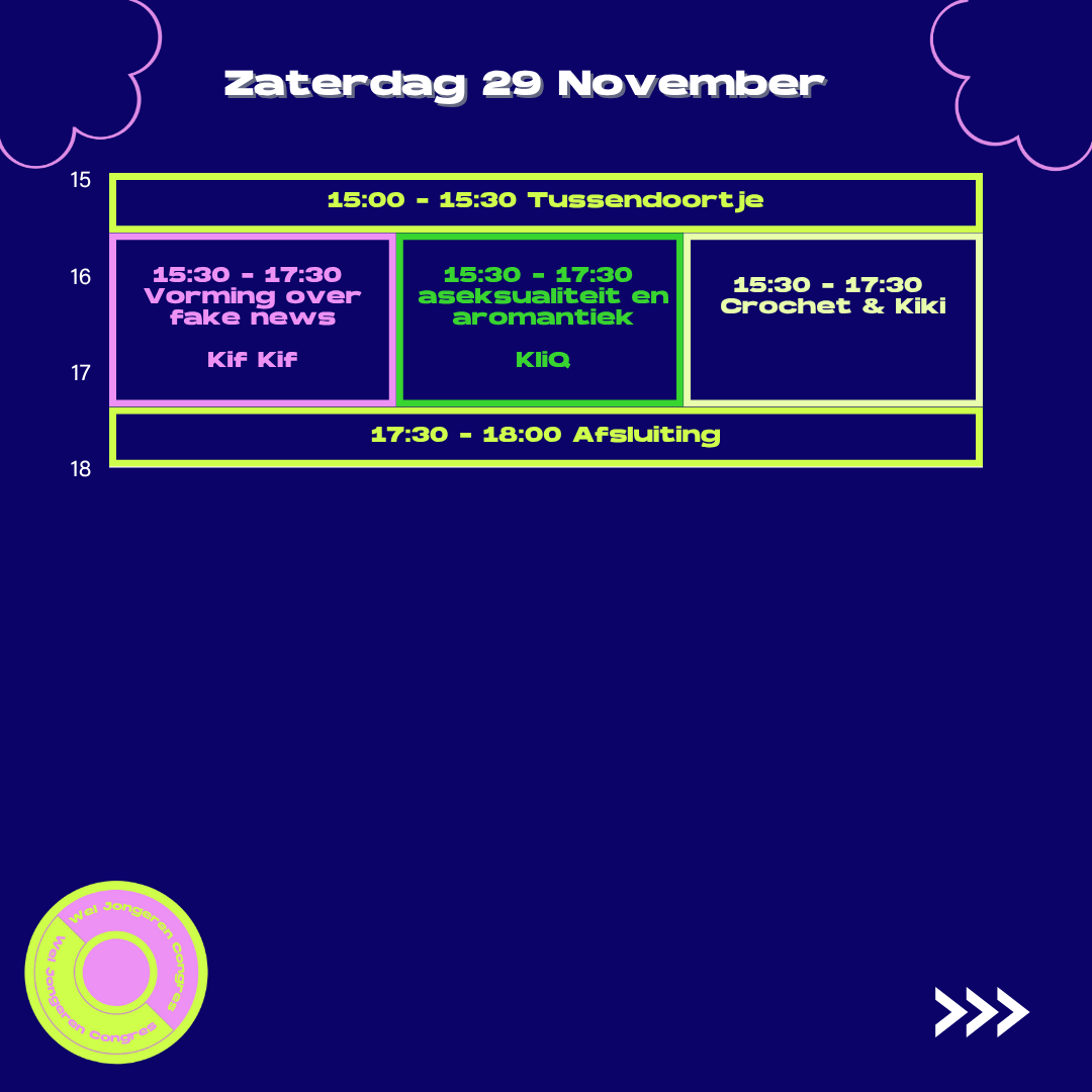 Als er één ding is waar wij als LGBTQ+ personen altijd op kunnen terugvallen, dan is het wel onze community. Tijdens het congres staat het ontmoeten van andere LGBTQ+ jongeren en partners centraal, in een veilige en vertrouwde omgeving. Bij Out for the Win wordthet kubben for the win. Daarnaast komt Kliq twee boeiende vormingen geven: Non-binary talk en Aseksualiteit & aromantiek.. Zo bouw je op het congres niet alleen mee aan onze community, maar ook aan die van jezelf.
