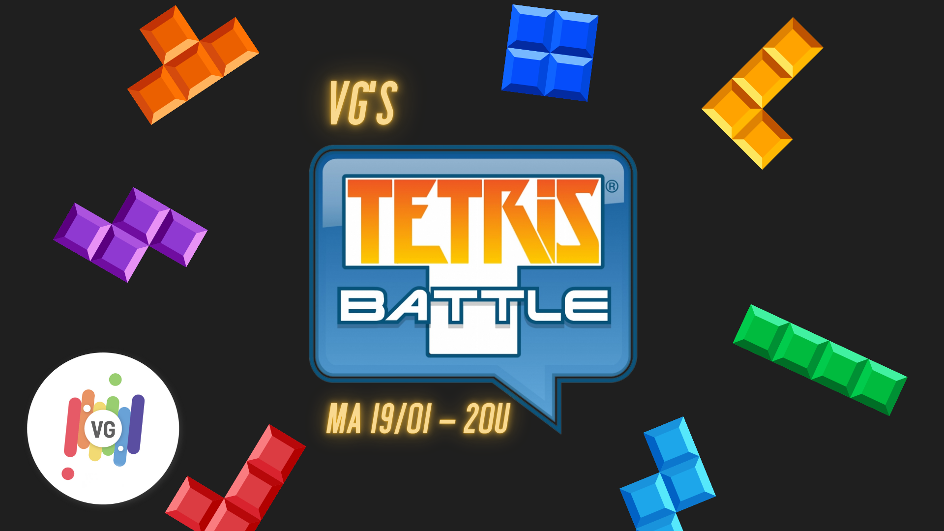 Heb je even nood aan een activiteit waarbij je je hoofd niet te veel moet gebruiken? Wil je nog even ontsnappen van de studieboeken of werklast? Dan hebben wij op maandag 19 januari een toffe activiteit voor jou in petto! We gaan dan namelijk online een Tetris battle houden. ☺️ Uiteraard zal er zoals gewoonlijk ruimte zijn voor een knabbeltje, drankje en babbeltje! Tot dan! 🟥🟨🟧🟩