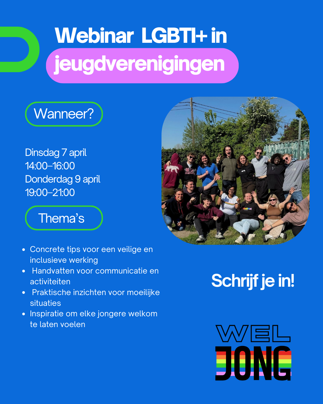 LGBTI+ in jeugdverenigingen is een inspirerend en praktijkgericht webinar van Wel Jong waarin je concrete tips, inzichten en handige tools krijgt om diversiteit en inclusie écht vorm te geven binnen jouw werking.